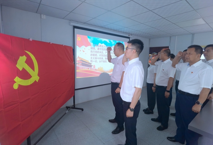 黨支部書記王小龍帶領(lǐng)新黨員入黨宣誓,老黨員一起重溫入黨誓詞。