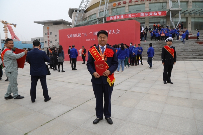 4月28日,在寶雞市慶?!拔逡弧眹?guó)際勞動(dòng)節(jié)大會(huì)上,集團(tuán)公司李紅軍同志被寶雞總工會(huì)授予五一勞動(dòng)獎(jiǎng)?wù)?,并上臺(tái)領(lǐng)獎(jiǎng)。(左三)